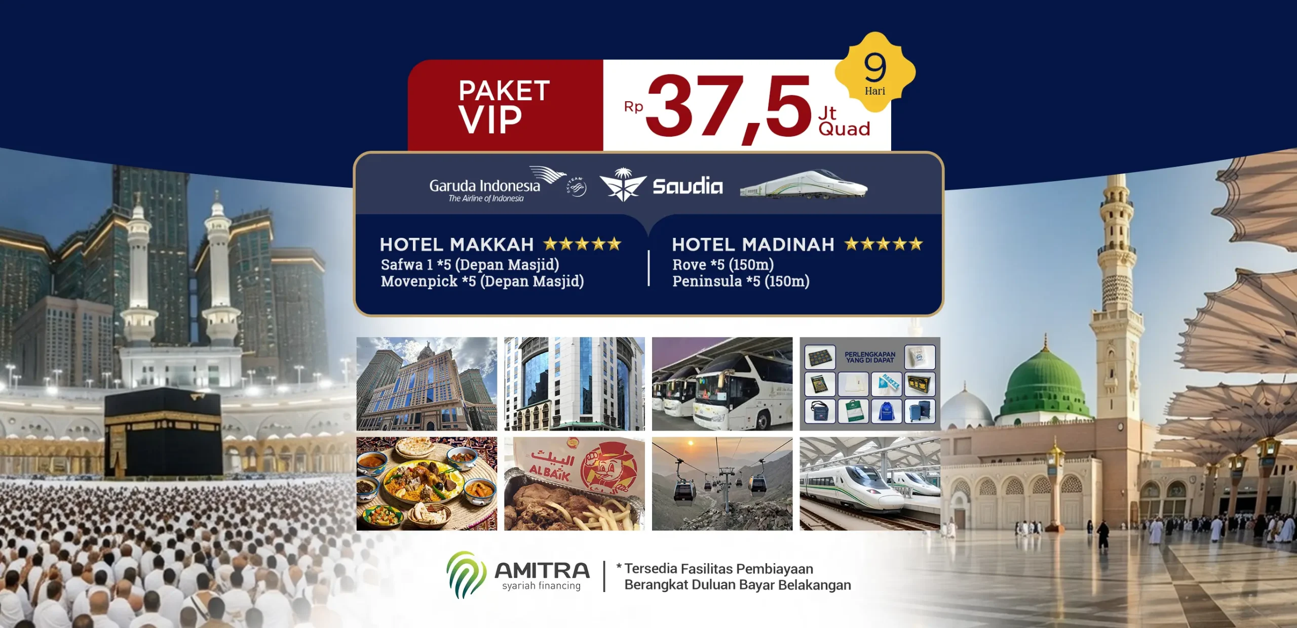 Paket Umrah VIP adalah paket reguler dengan fasilitas pesawat derect (Tanpa transit) ini sangat cocok bagi jamaah yang ingin focus ibadah tanpa repot transit. VIP Dengan fasilitas pesawat Garuda Indonesia / Saudi Airlines (pesawat terbaik dikelasnya), hotel bintang 5 Ring satu, Shofwa Dar aiman*5 dengan menu makan FB Hotel, dan berjarak sangat dekat / depan Masjidil Haram, dan Madinah (Rove*5/Peninsula*5) +/- 200m dari Masjid Nabawi.